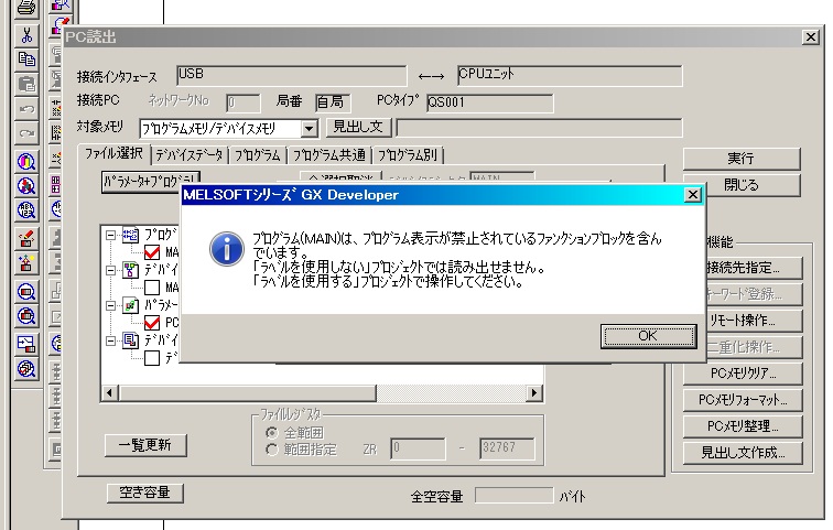 (2) 「GX Developwer上でQSCPUのプロジェクトファイル(形式:"ラベルを使用しない")を開いている状態」からPC読出ができない場合【添付ファイルあり】